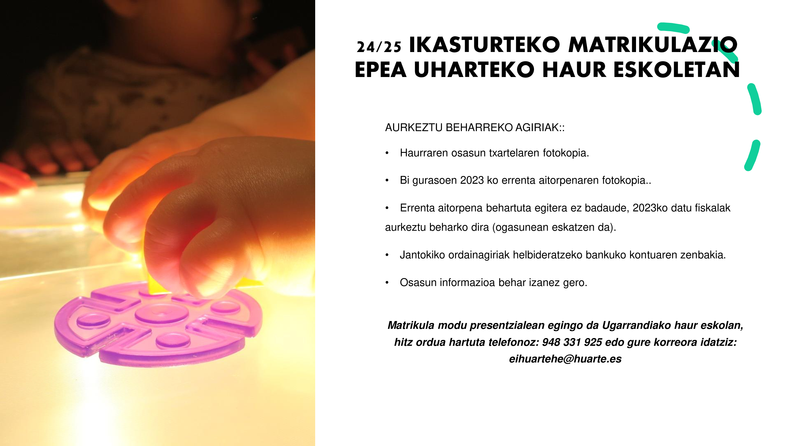 Onartutako ikasleen matrikula aurrez aurre egingo da Ugarrandiako Haur Eskolan, aldez aurretik hitzordua eskatuta eta erantsitako dokumentuan adierazten diren dokumentuak aurkeztuta.