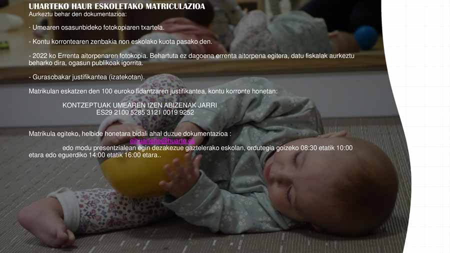 Matrikula egiteko, helbide honetara bidali ahal duzue dokumentazioa : eihuartehe@huarte.es edo modu presentzialean egin dezakezue gaztelerako eskolan, ordutegia goizeko 08:30 etatik 10:00 etara edo eguerdiko 14:00 etatik 16:00 etara.