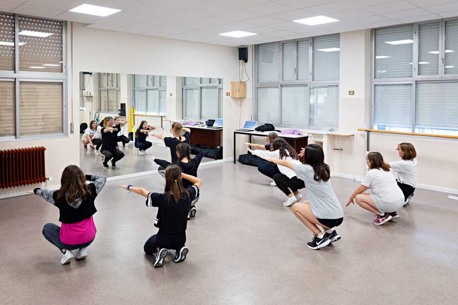Altzaririk gabeko gela, 150 m2-koa, 50 lagunentzako. Ispilua, binilozko zorua eta soinu sistema ditu.