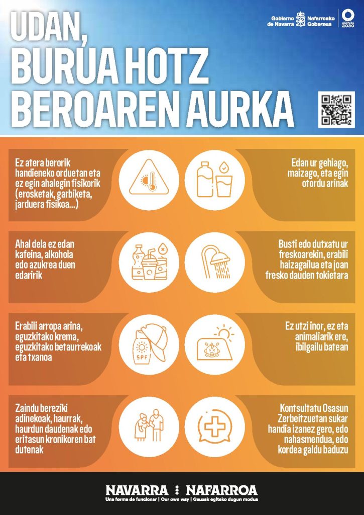 Honekin batera, kontuan hartu Nafarroako Gobernuak tenperatura altuen aurrean emandako gomendioak, gure osasunean eragina izan dezaketenak.