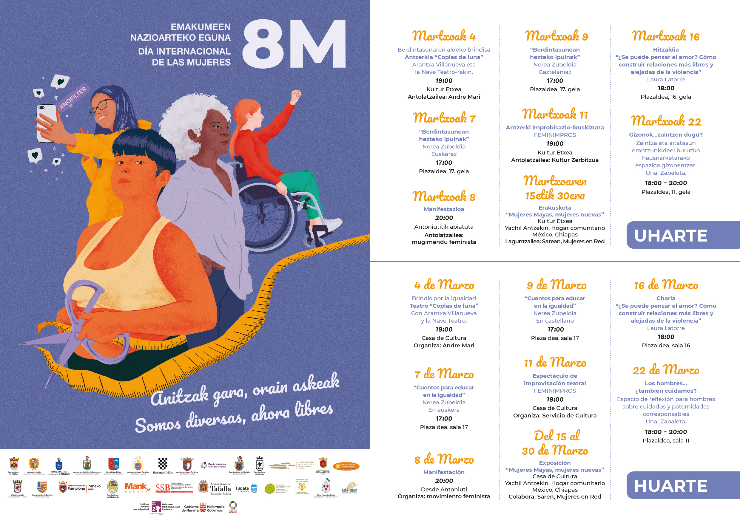 Con motivo del 8 de marzo, Día Internacional de las Mujeres, 26 Entidades Locales de Navarra, entre ellas el Ayuntamiento de Huarte, han impulsado una campaña conjunta bajo el lema “Somos diversas, ahora libres”. A través de la campaña se pretende reivindicar la diversidad y la visibilidad de todas las mujeres. La libertad de las mujeres está continuamente condicionada por unos estereotipos de género basados en modelos femeninos de belleza, que marcan unas normas estéticas que no se corresponden con la diversidad de los cuerpos y de las mujeres, y que en muchas ocasiones resultan irreales y utópicos.