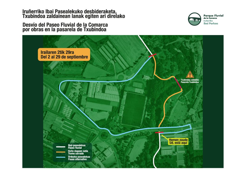 La Mancomunidad de la Comarca de Pamplona va a proceder a acondicionar la pasarela sita en el paraje de Txubindoa, concretamente van a sustituir los perfiles para garantizar la sujeción del firme de la pasarela. Para la ejecución de los trabajos se desmontan todas las tablas que volverán a ser colocadas una vez se haya sustituido las correas.
