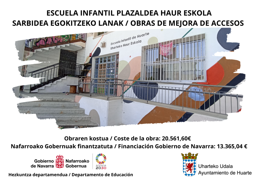 Gracias a la iniciativa de la Escuela Infantil Plazaldea de Huarte, el Ayuntamiento ha logrado una subvención concedida por el Departamento de Educación del Gobierno de Navarra con la que realizar una obra para mejorar la accesibilidad a la misma desde el patio de Plazaldea.