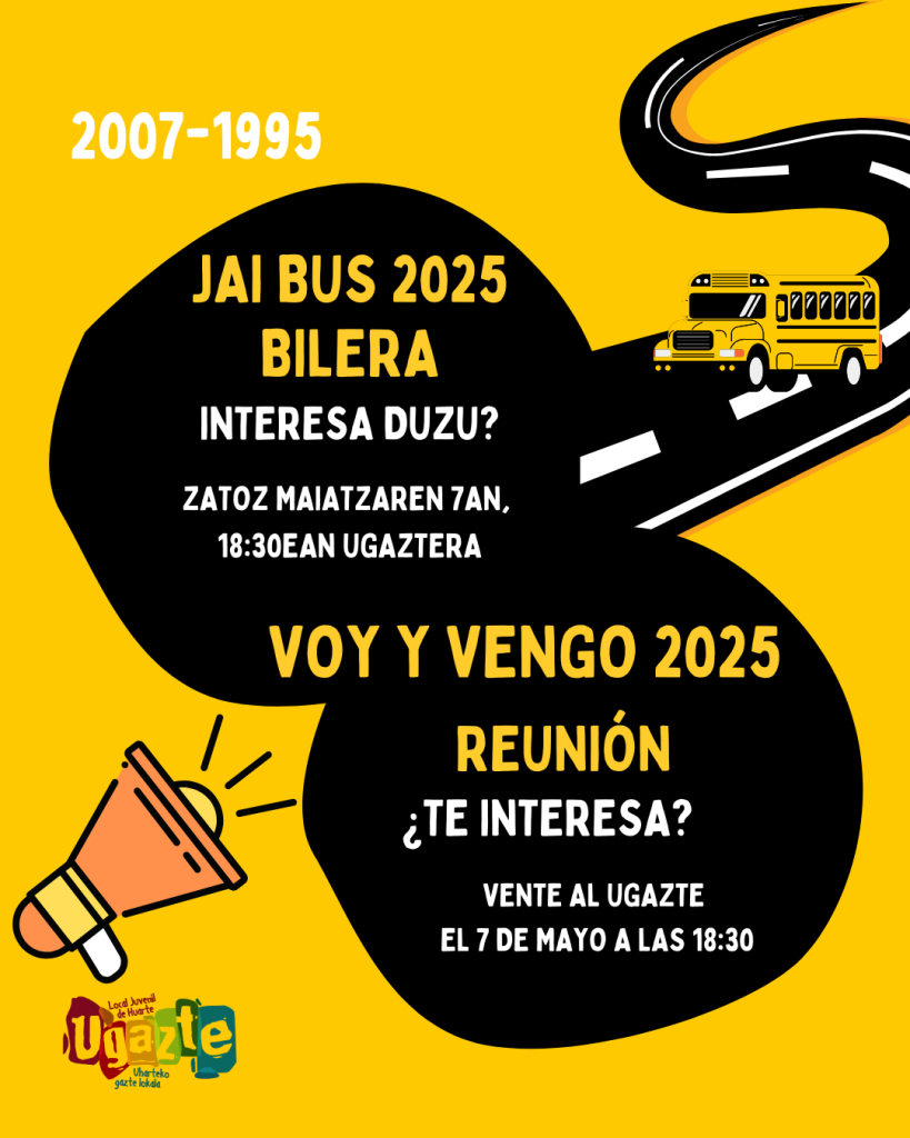 Desde el Ayuntamiento y Mancomunidad de Servicios Sociales estamos trabajando en la Campaña “Voy y vengo” para este verano 2024. Para seleccionar las fiestas y decidir responsables de bus, os convocamos a mínimo una persona representante de cada cuadrilla interesada en utilizarlo (nacidxs 2007-1995) a una reunión el 7 de mayo, miércoles, a las 18:30 en el Ugazte. De vuestra participación e implicación dependerá que este verano haya autobús “Voy y vengo”, así que ¡animaos!