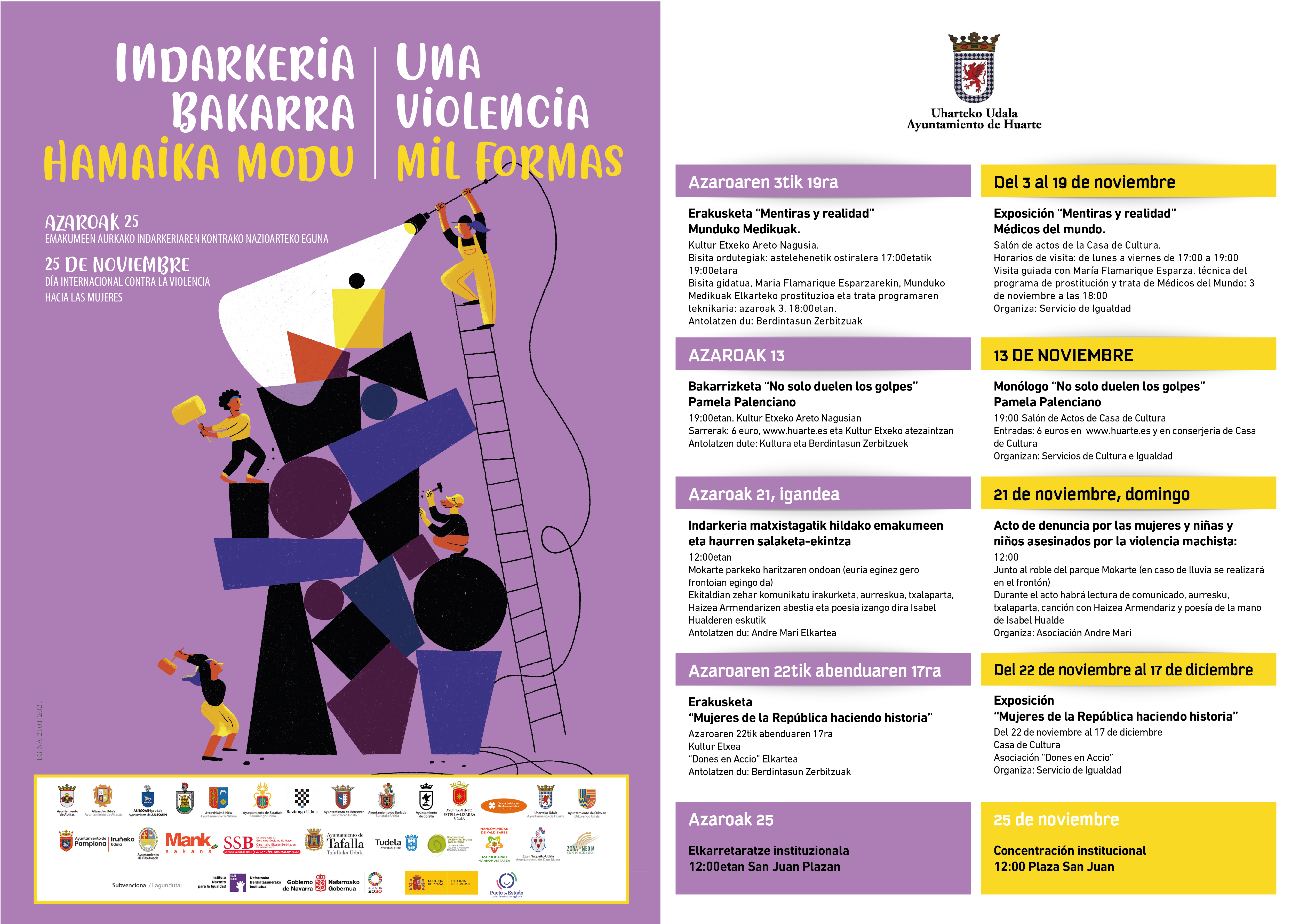 Bajo le lema “Una violencia, mis formas” se ha querido poner el foco en las múltiples formas de violencia hacia las mujeres, muchas de ellas invisibilizadas e incluso normalizadas. Porque las cifras oficiales solo nos muestran una realidad, la de la violencia en el contexto de la pareja o la expareja, y generalmente se refleja la violencia física, dejando ocultas otras: la violencia psicológica, las diferentes manifestaciones de la violencia sexual, la violencia institucional, la violencia económica, la violencia simbólica o la violencia vicaria. Porque ésta se da en todos los ámbitos, públicos y privados, y en todas las clases sociales y contextos culturales.